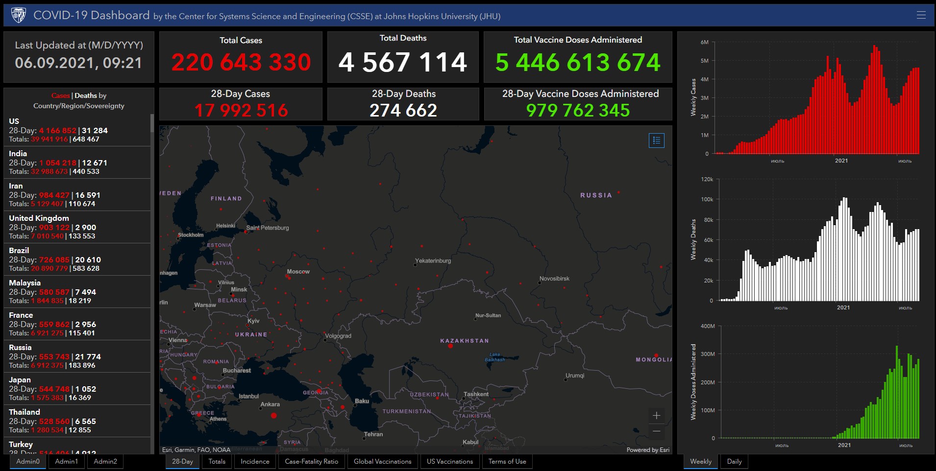 Всего в мире коронавирусом заразились 220 миллионов 643 тысячи 330 человек. Больше всего зараженных в США (39 миллионов 941 тысяча 916), Индии (32 миллиона 988 тысяч 673), Бразилии (20 миллионов 890 тысяч 779), Франции (6 миллионов 921 тысяча 275), Великобритании (7 миллионов 10 тысяч 540), России (6 миллионов 912 тысяч 375), Турции (6 миллионов 412 тысяч 247), Аргентине (5 миллионов 203 тысячи 802), Иране (5 миллионов 129 тысяч 407), Колумбии (4 миллиона 918 тысяч 649), Испании (4 миллиона 877 тысяч 755), Италии (4 миллиона 571 тысяча 440) и Германии (4 миллиона 13 тысяч 808).