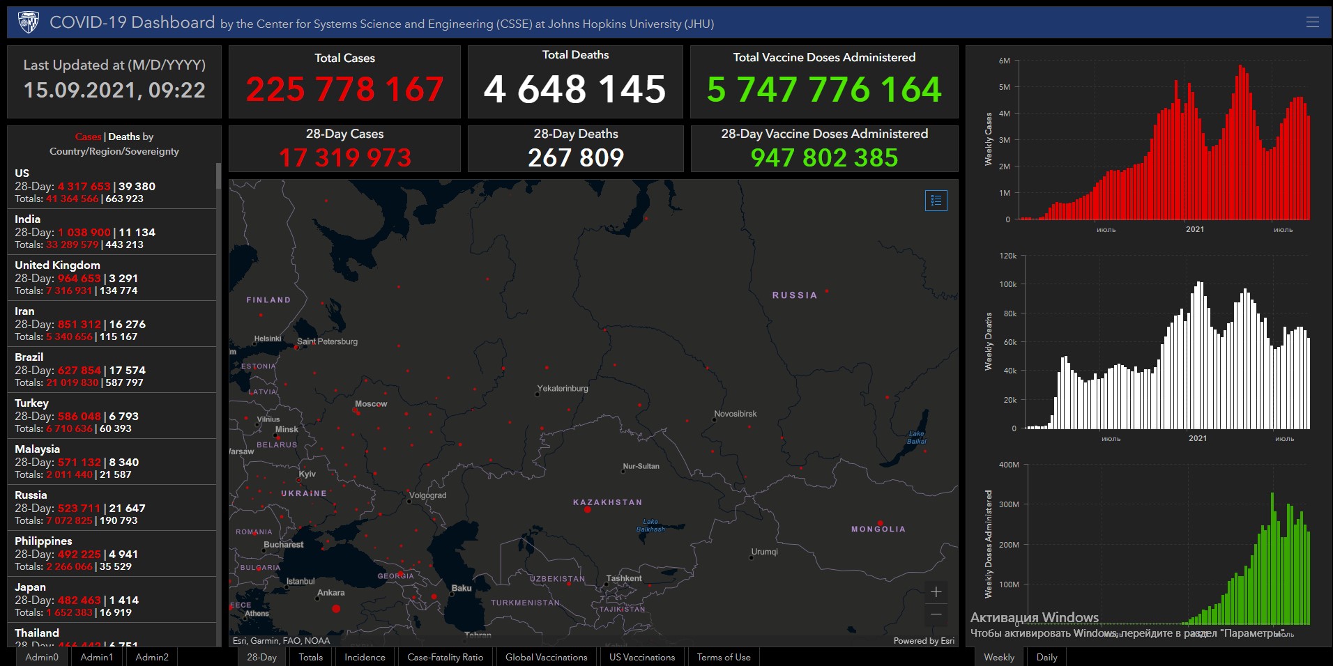 Всего в мире коронавирусом заразились 225 миллионов 778 тысяч 167 человек. Больше всего зараженных в США (41 миллион 364 тысячи 566), Индии (33 миллиона 289 тысяч 579), Бразилии (21 миллион 19 тысяч 830), Франции (7 миллионов 7 тысяч 436), Великобритании (7 миллионов 316 тысяч 931), России (7 миллионов 72 тысячи 825), Турции (6 миллионов 710 тысяч 636), Аргентине (5 миллионов 229 тысяч 848), Иране (5 миллионов 340 тысяч 656), Колумбии (4 миллиона 932 тысячи 998), Испании (4 миллиона 918 тысяч 526), Италии (4 миллиона 613 тысяч 214) и Германии (4 миллиона 102 тысячи 252).
