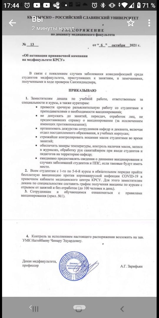 Всем студентам с 1-го по 5-6-й курс в обязательном порядке поручено пройти бесплатную вакцинацию против коронавируса в прививочном кабинете медцентра КРСУ. Для этого заместителям декана необходимо составить график получения вакцины по курсам с отрывом от занятий и без отработок (до 100 человек в день).