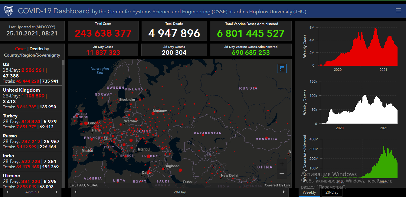 Всего в мире коронавирусом заразились 243 миллиона 638 тысяч 377 человек. Больше всего зараженных в США (45 миллионов 444 тысячи 228), Индии (34 миллиона 175 тысяч 468), Бразилии (21 миллион 729 тысяч 763), Франции (7 миллионов 226 тысяч 974), Великобритании (8 миллионов 814 тысяч 735), России (8 миллионов 112 тысяч 999), Турции (7 миллионов 851 тысяча 775), Аргентине (5 миллионов 280 тысяч 358), Иране (5 миллионов 860 тысяч 844), Колумбии (4 миллиона 991 тысяча 50), Испании (4 миллиона 997 тысяч 732), Италии (4 миллиона 741 тысяча 185) и Германии (4 миллиона 476 тысяч 78).