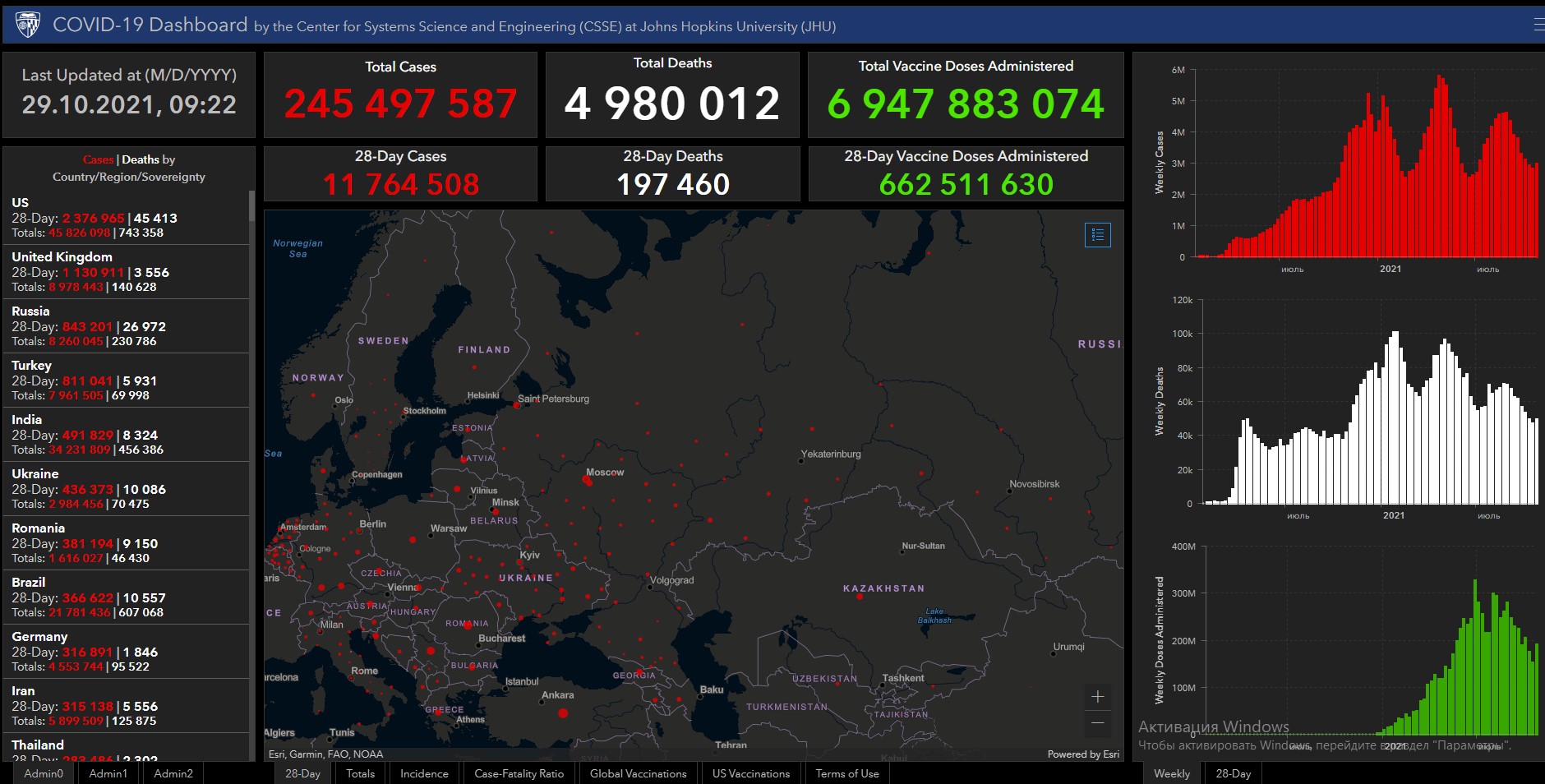 Всего в мире коронавирусом заразились 245 миллионов 497 тысяч 587 человек. Больше всего зараженных в США (45 миллионов 826 тысяч 98), Индии (34 миллиона 231 тысяча 809), Бразилии (21 миллион 781 тысяча 436), Франции (7 миллионов 248 тысяч 285), Великобритании (8 миллионов 978 тысяч 443), России (8 миллионов 260 тысяч 45), Турции (7 миллионов 961 тысяча 505), Аргентине (5 миллионов 286 тысяч 74), Иране (5 миллионов 899 тысяч 509), Колумбии (4 миллиона 997 тысяч 444), Испании (5 миллионов 8 тысяч 887), Италии (4 миллиона 757 тысяч 231) и Германии (4 миллиона 553 тысячи 773).