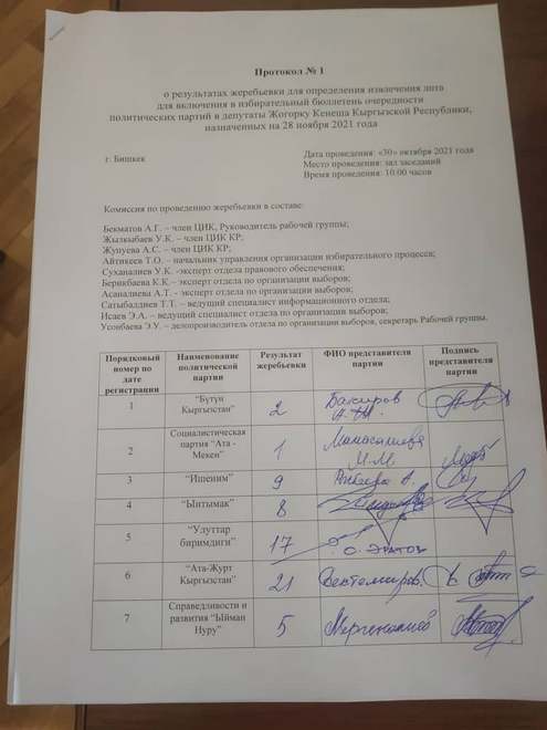 Центральная комиссия по выборам и проведению референдумов провела жеребьевку среди политических партий, баллотирующихся по единому избирательному округу, для определения очередности включения их в избирательный бюллетень.