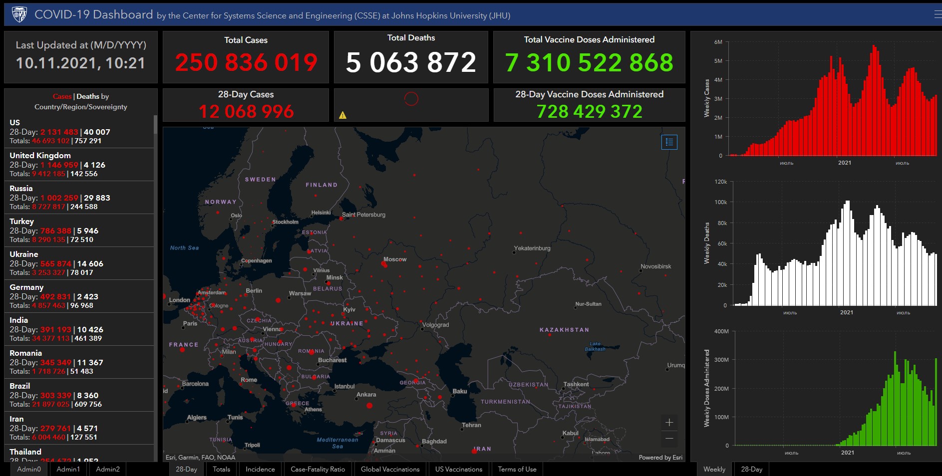 Всего в мире коронавирусом заразились 250 миллионов 836 тысяч 19 человек. Больше всего зараженных в США (46 миллионов 693 тысячи 102), Индии (34 миллиона 377 тысяч 113), Бразилии (21 миллион 897 тысяч 25), Франции (7 миллионов 334 тысячи 332), Великобритании (9 миллионов 412 тысяч 185), России (8 миллионов 727 тысяч 817), Турции (8 миллионов 290 тысяч 135), Аргентине (5 миллионов 299 тысяч 418), Иране (6 миллионов 4 тысячи 460), Колумбии (5 миллионов 19 тысяч 158), Испании (5 миллионов 32 тысячи 56), Италии (4 миллиона 818 тысяч 705) и Германии (4 миллиона 857 тысяч 463).