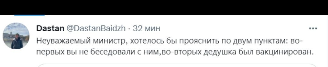 «Неуважаемый министр, хотелось бы прояснить по двум пунктам: во-первых, вы не беседовали с ним (Маром Байджиевым. — Прим. 24-kg.com), во-вторых, дедушка был вакцинирован», — написал он.