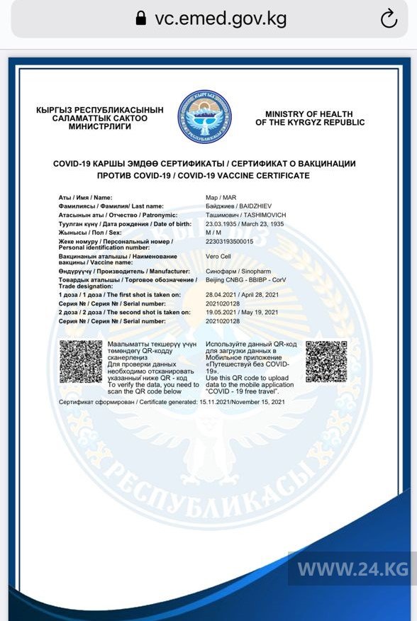 Он рассказал 24-kg.com, что Мар Байджиев болел коронавирусом. «Он лечился в больнице. Но насчет того, что он был не вакцинирован, — это неправда. Он был привит. У меня есть его сертификат о вакцинации», — сказал Дастан Байджиев.
