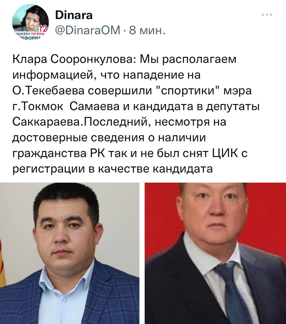 По его словам, он еще не решил, когда будет обращаться в суд, но его возмутила публикация в соцсетях со ссылкой на Клару Сооронкулову, что «нападение на лидера партии «Ата Мекен» Омурбека Текебаева совершено «спортиками» мэра Токмака Урматбека Самаева и кандидата в депутаты ЖК Медербека Саккараева».