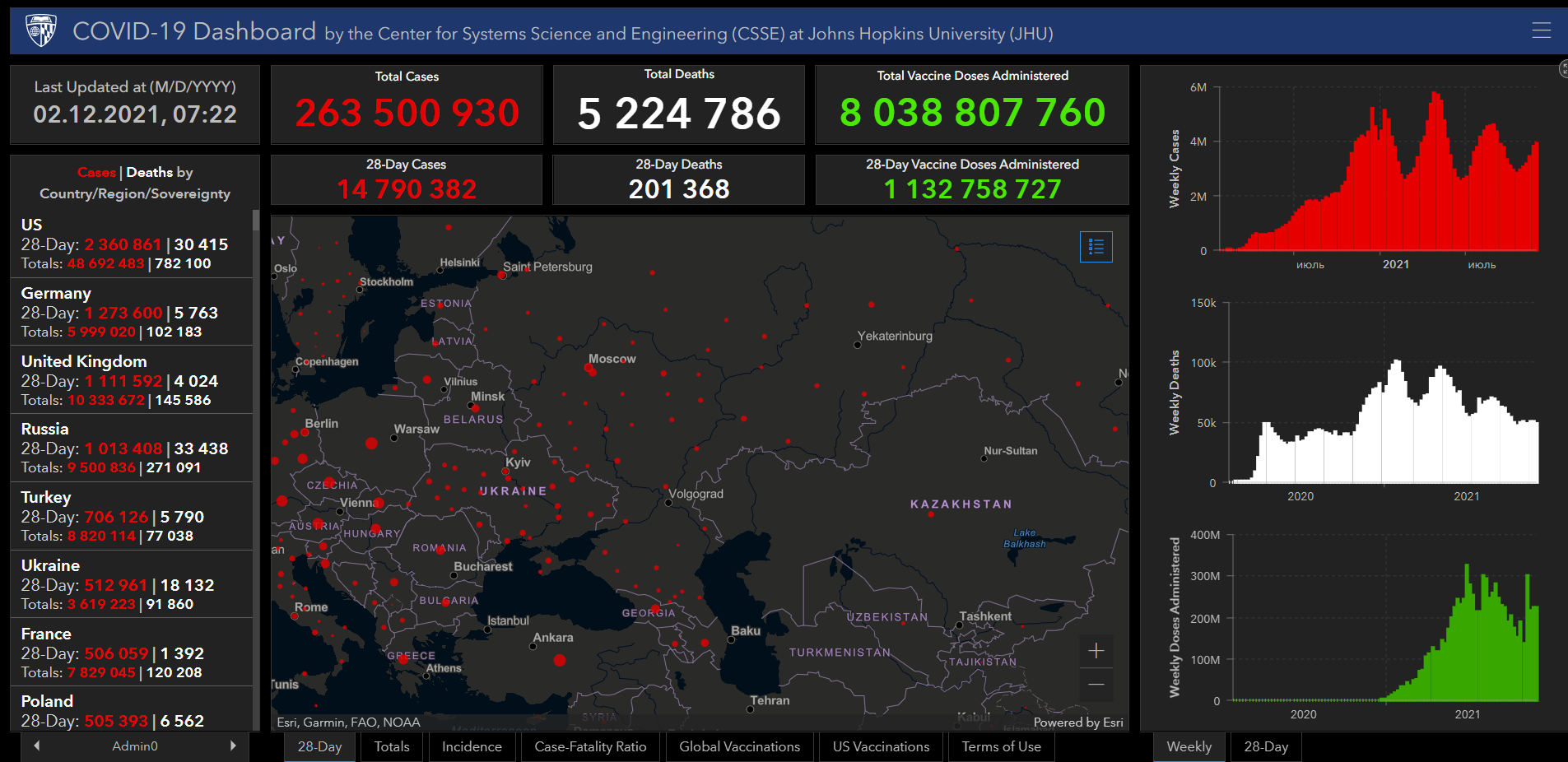 Всего в мире коронавирусом заразились 263 миллиона 500 тысяч 930 человек. Больше всего зараженных в США (48 миллионов 692 тысячи 483), Индии (34 миллиона 596 тысяч 776), Бразилии (22 миллиона 105 тысяч 872), Франции (7 миллионов 829 тысяч 45), Великобритании (10 миллионов 333 тысячи 672), России (9 миллионов 500 тысяч 836), Турции (8 миллионов 820 тысяч 114), Аргентине (5 миллионов 332 тысячи 629), Иране (6 миллионов 121 тысяча 757), Колумбии (5 миллионов 71 тысяча 817), Испании (5 миллионов 174 тысячи 720), Италии (5 миллионов 43 тысячи 620) и Германии (5 миллионов 999 тысяч 20).