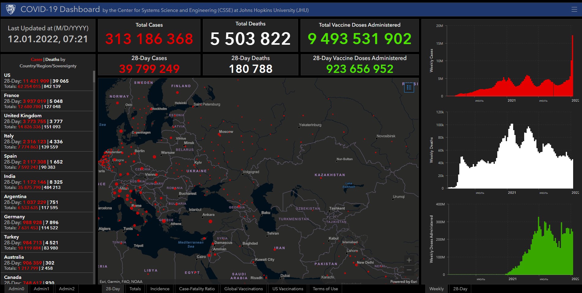 Всего в мире коронавирусом заразились 313 миллионов 186 тысяч 368 человек. Больше всего зараженных в США (62 миллиона 254 тысячи 15), Индии (35 миллионов 875 тысяч 790), Бразилии (22 миллиона 563 тысячи 104), Франции (12 миллионов 680 тысяч 780), Великобритании (14 миллионов 826 тысяч 336), России (10 миллионов 503 тысячи 101), Турции (10 миллионов 119 тысяч 884), Аргентине (6 миллионов 533 тысячи 635), Иране (6 миллионов 210 тысяч 298), Колумбии (5 миллионов 380 тысяч 841), Испании (7 миллионов 592 тысячи 242), Италии (7 миллионов 774 тысячи 863) и Германии (7 миллионов 631 тысяча 453).
