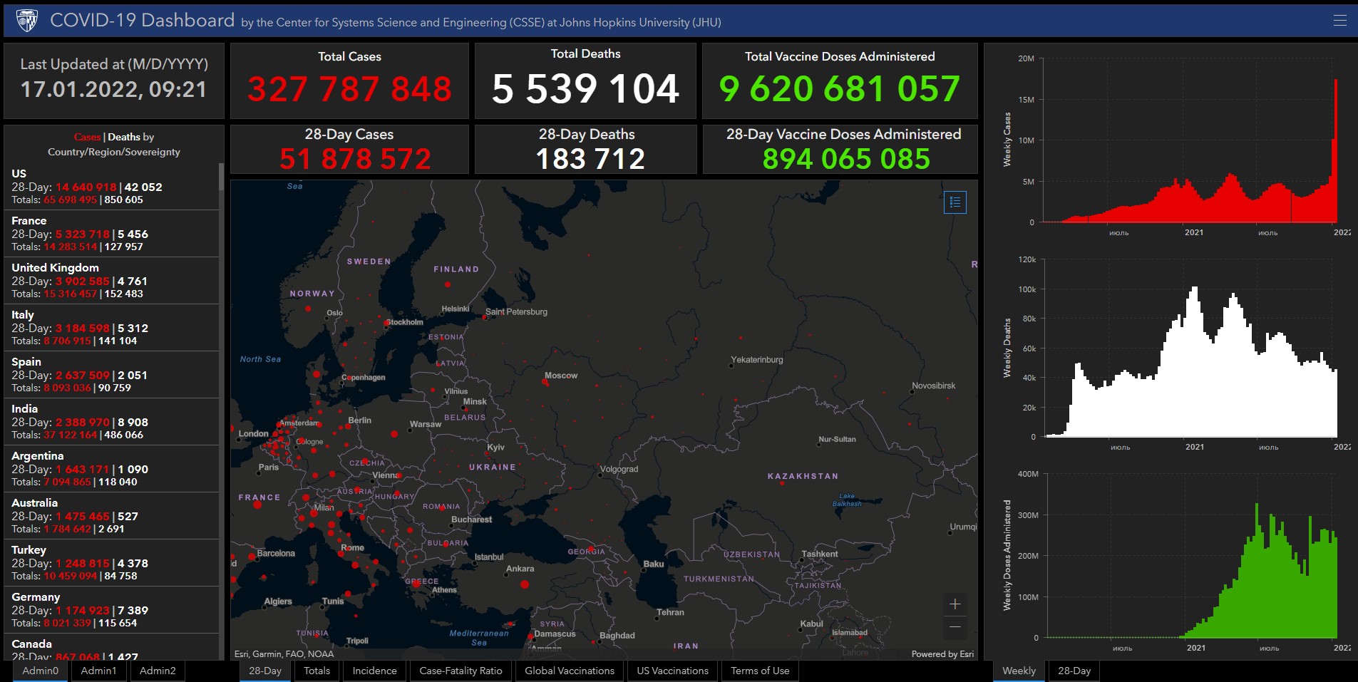 Всего в мире коронавирусом заразились 327 миллионов 787 тысяч 848 человек. Больше всего зараженных в США (65 миллионов 698 тысяч 495), Индии (37 миллионов 122 тысячи 164), Бразилии (23 миллиона 15 тысяч 128), Франции (14 миллионов 283 тысячи 514), Великобритании (15 миллионов 316 тысяч 457), России (10 миллионов 621 тысяча 410), Турции (10 миллионов 459 тысяч 94), Аргентине (7 миллионов 94 тысячи 865), Иране (6 миллионов 221 тысяча 33), Колумбии (5 миллионов 543 тысячи 796), Испании (8 миллионов 93 тысячи 36), Италии (8 миллионов 706 тысяч 915) и Германии (8 миллионов 21 тысяча 339).
