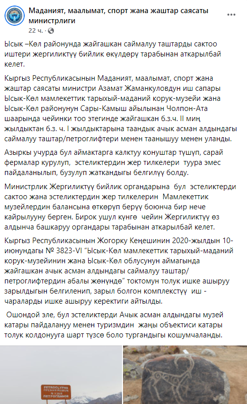 Напомним, ранее в Министерстве культуры, информации, спорта и молодежной политики заявили, что в Иссык-Кульском районе местные власти не принимают меры для сохранения петроглифов.