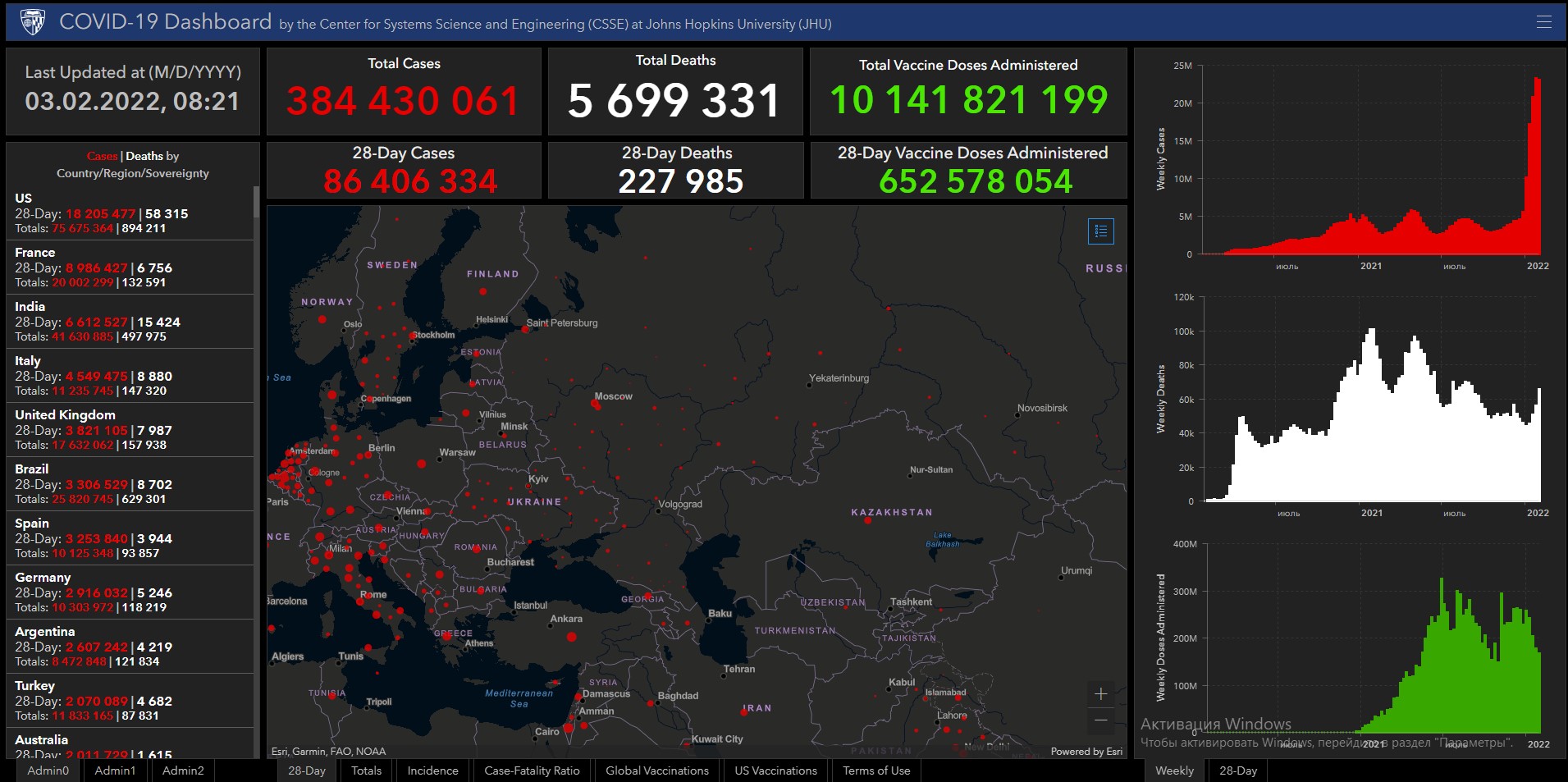 Всего в мире коронавирусом заразились 384 миллиона 430 тысяч 61 человек. Больше всего зараженных в США (75 миллионов 675 тысяч 364), Индии (41 миллион 630 тысяч 885), Бразилии (25 миллионов 820 тысяч 745), Франции (20 миллионов 2 тысячи 299), Великобритании (17 миллионов 632 тысячи 62), России (11 миллионов 936 тысяч 64), Турции (11 миллионов 833 тысячи 165), Аргентине (8 миллионов 472 тысячи 848), Иране (6 миллионов 446 тысяч 404), Колумбии (5 миллионов 916 тысяч 825), Испании (10 миллионов 125 тысяч 348), Италии (11 миллионов 235 тысяч 745) и Германии (10 миллионов 303 тысячи 972).