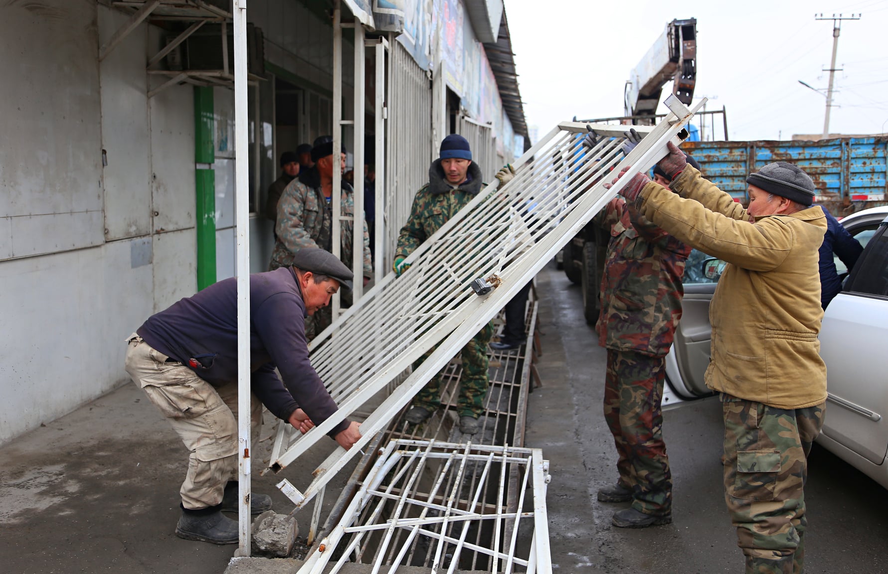 В Оше начался снос незаконных ограждений на вещевом рынке по улице Бабараимова. Об этом сообщили в мэрии.