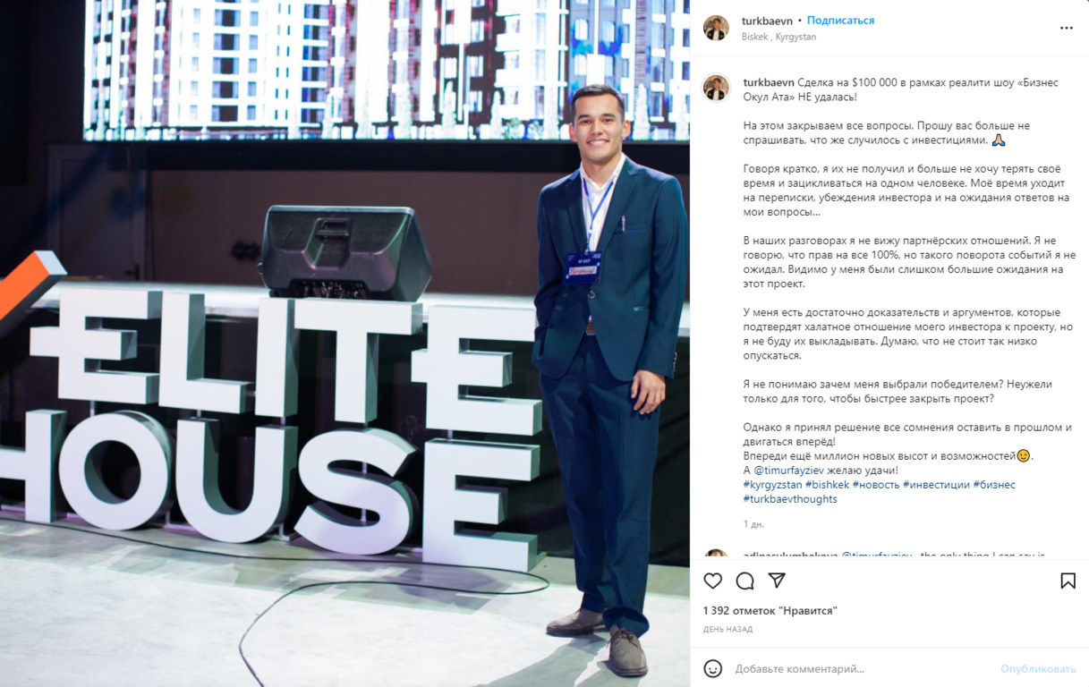 Победитель проекта «Бизнес окул ата» Нурмухаммад Туркбаев заявил о провале сделки на $100 тысяч с предпринимателем и руководителем госдирекции по строительству города Асмана на Иссык-Куле Тимуром Файзиевым. Об этом он сообщил на своей странице Instagram.
