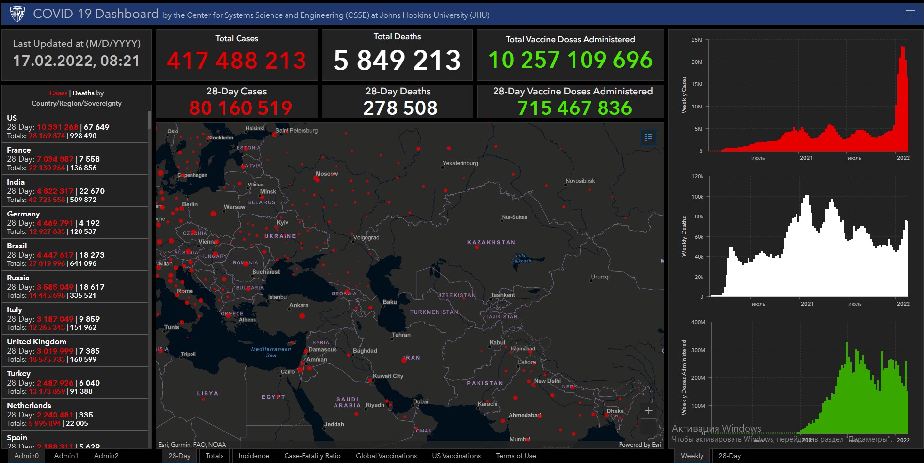 COVID-19 в мире. Заразились более 417,4 миллиона, умерли более 5,8 миллиона