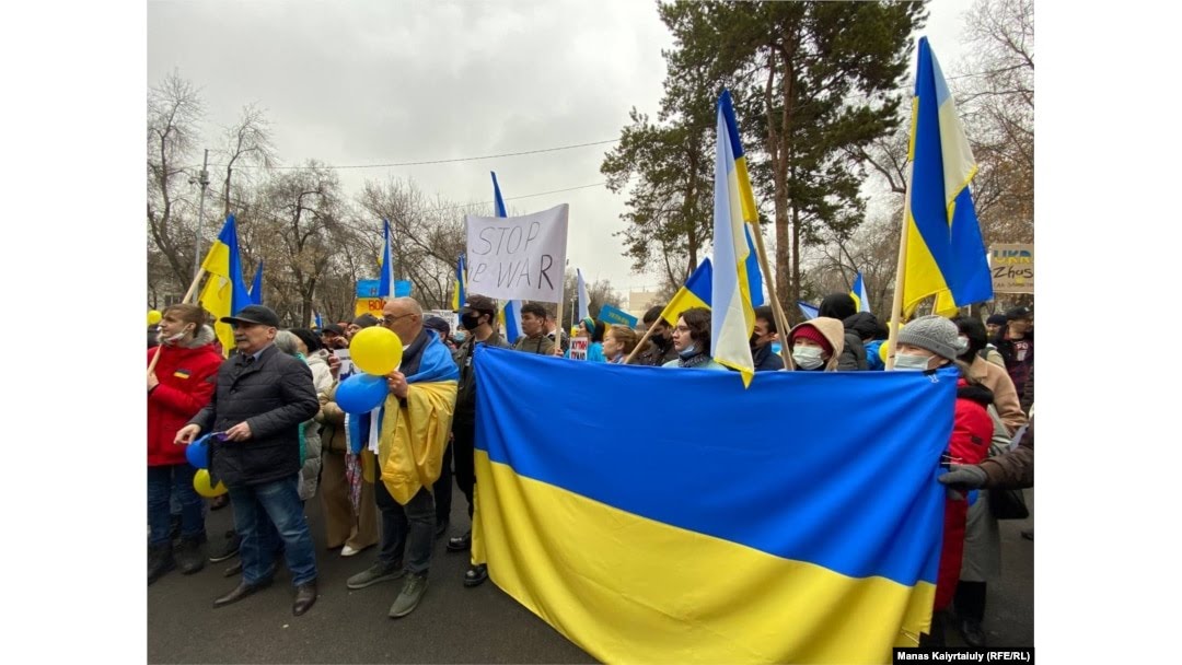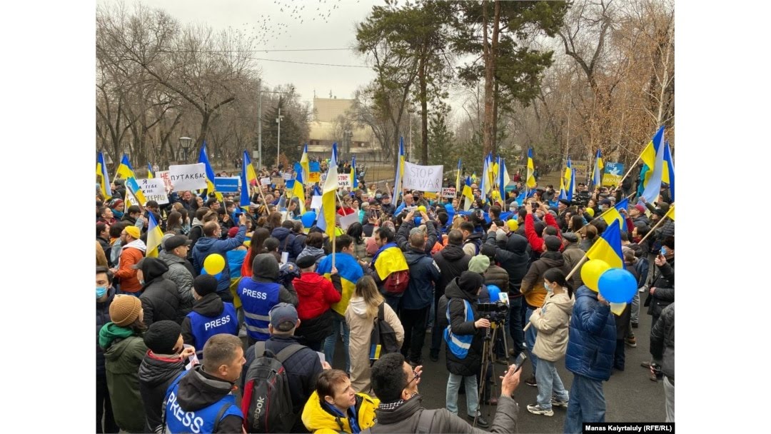«На фотографиях с митинга заметно множество украинских флагов, люди кричат «Украина, жасасын!» («Да здравствует Украина»), «Нет войне», «Путин, Гаага, тюрьма!», — передает «Азаттык».