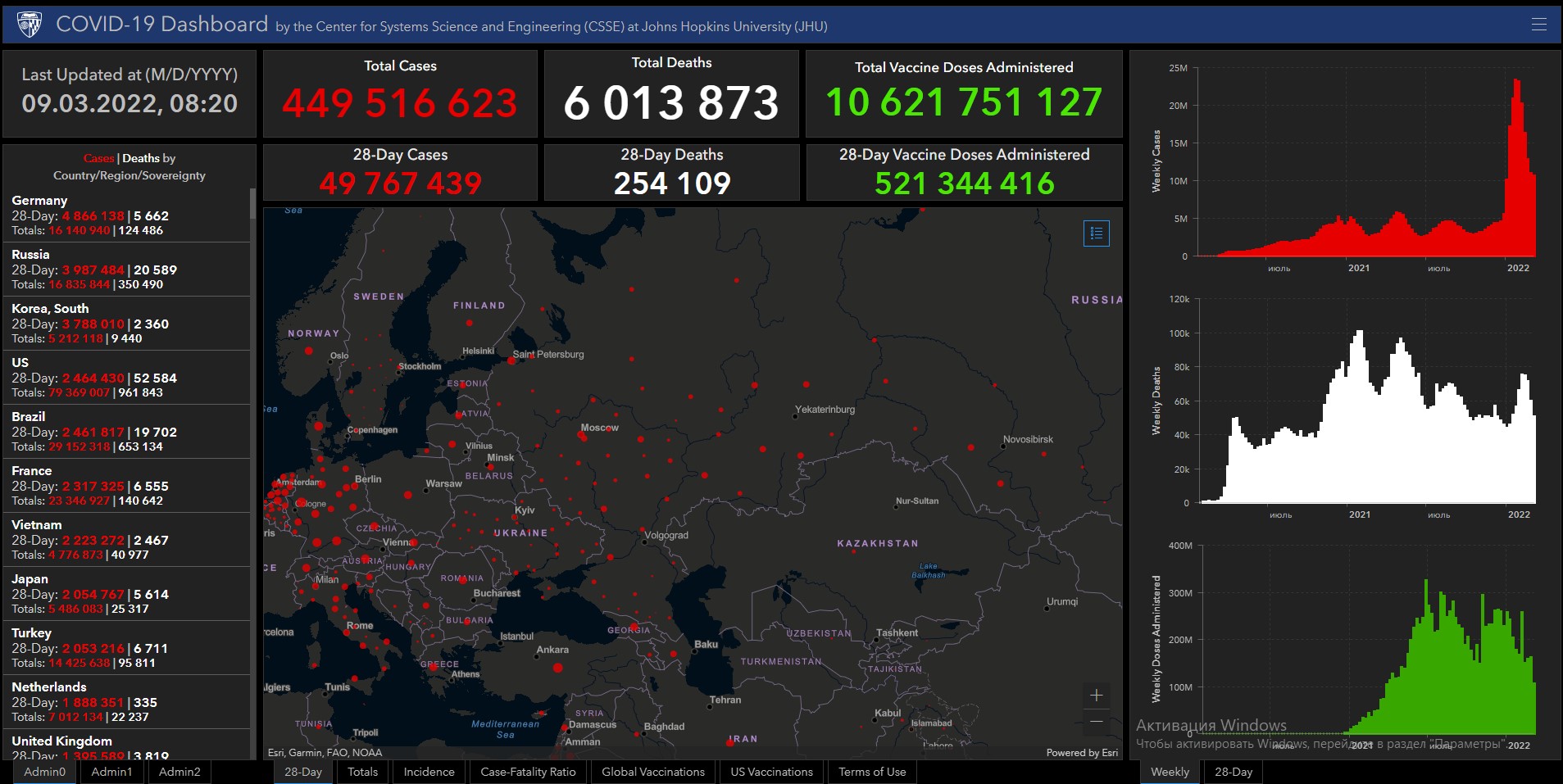 Всего в мире коронавирусом заразились 449 миллионов 516 тысяч 623 человека. Больше всего зараженных в США (79 миллионов 369 тысяч 7), Индии (42 миллиона 971 тысяча 308), Бразилии (29 миллионов 152 тысячи 318), Франции (23 миллиона 346 тысяч 927), Великобритании (19 миллионов 446 тысяч 892), России (16 миллионов 835 тысяч 844), Турции (14 миллионов 425 тысяч 638), Аргентине (8 миллионов 949 тысяч 362), Иране (7 миллионов 102 тысячи 159), Колумбии (6 миллионов 73 тысячи 416), Испании (11 миллионов 159 тысяч 574), Италии (13 миллионов 109 тысяч 527) и Германии (16 миллионов 140 тысяч 940).