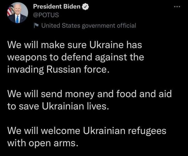 Джо Байден написал твит в своем Twitter: «Мы позаботимся о том, чтобы у Украины было оружие для защиты от российского вторжения. Мы предоставим деньги, еду и поддержку, чтобы спасти жизнь украинцев. Мы будем приветствовать украинских беженцев с распростертыми объятиями».