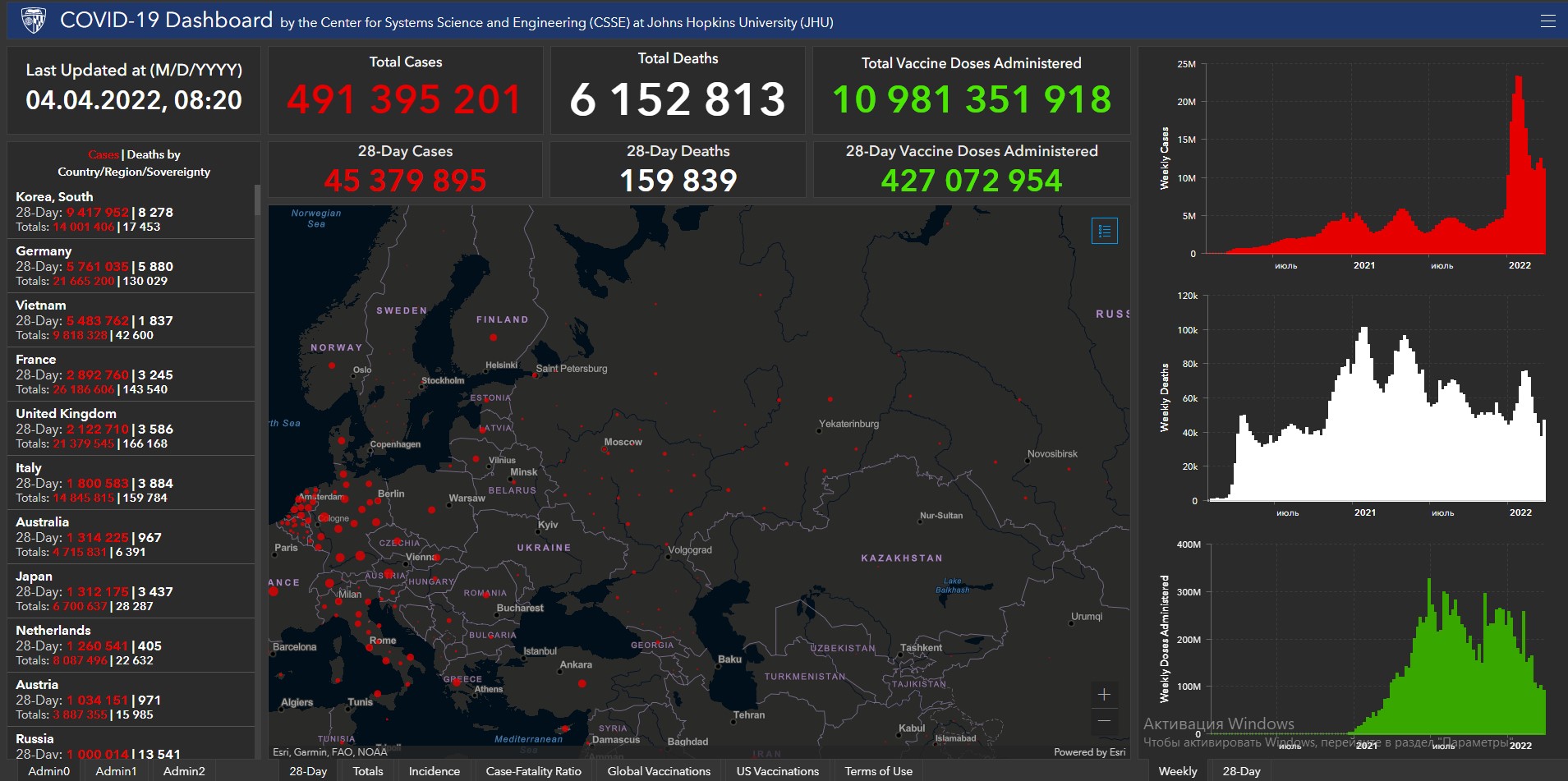 Всего в мире коронавирусом заразились 491 миллион 395 тысяч 201 человек. Больше всего зараженных в США (80 миллионов 155 тысяч 397), Индии (43 миллиона 28 тысяч 131), Бразилии (30 миллионов 2 тысячи 785), Франции (26 миллионов 186 тысяч 606), Великобритании (21 миллион 379 тысяч 545), России (17 миллионов 636 тысяч 19), Турции (14 миллионов 894 тысячи 731), Аргентине (9 миллионов 37 тысяч 911), Иране (7 миллионов 167 тысяч 646), Колумбии (6 миллионов 85 тысяч 926), Испании (11 миллионов 551 тысяча 574), Италии (14 миллионов 845 тысяч 815) и Германии (21 миллион 665 тысяч 200).