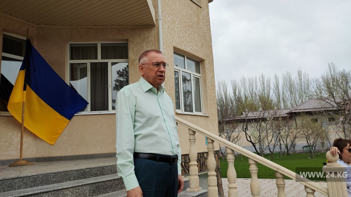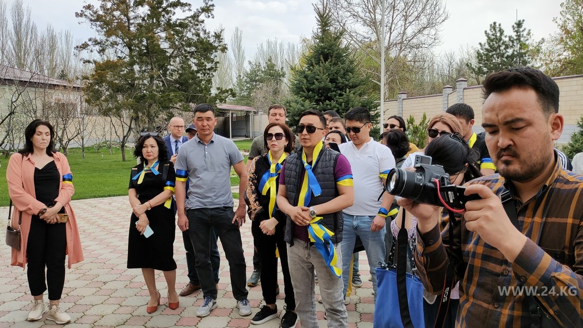 Примерно 30 человек зашли во двор диппредставительства и выразили слова соболезнования украинскому народу. К собравшимся вышел посол Украины в Кыргызстане Валерий Жовтенко.