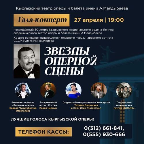 В Бишкеке 27 апреля состоится гала-концерт, посвященный 80-летию Кыргызского национального академического театра оперы и балета и дню рождения оперного певца, народного артиста СССР Булата Минжилкиева. Об этом сообщили в театре.