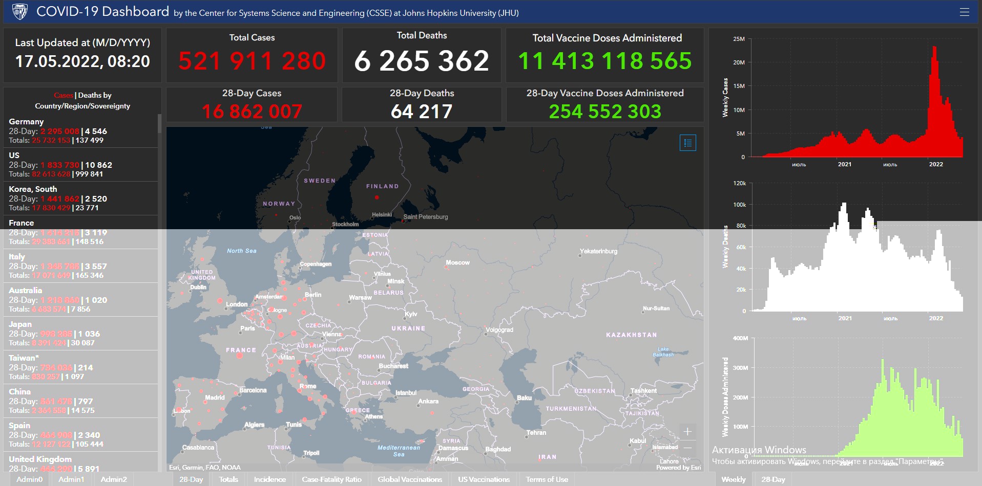 Всего в мире с начала пандемии коронавирусом заразились 521 миллион 911 тысяч 280 человек. Больше всего в США (82 миллиона 613 тысяч 628), Индии (43 миллиона 123 тысячи 801), Бразилии (30 миллионов 701 тысяча 900), Франции (29 миллионов 383 тысячи 661), Великобритании (22 миллиона 385 тысяч 203), России (17 миллионов 998 тысяч 438), Турции (15 миллионов 55 тысяч 576), Аргентине (9 миллионов 135 тысяч 308), Иране (7 миллионов 228 тысяч 434), Колумбии (6 миллионов 95 тысяч 316), Испании (12 миллионов 127 тысяч 122), Италии (17 миллионов 71 тысяча 649) и Германии (25 миллионов 732 тысячи 153).