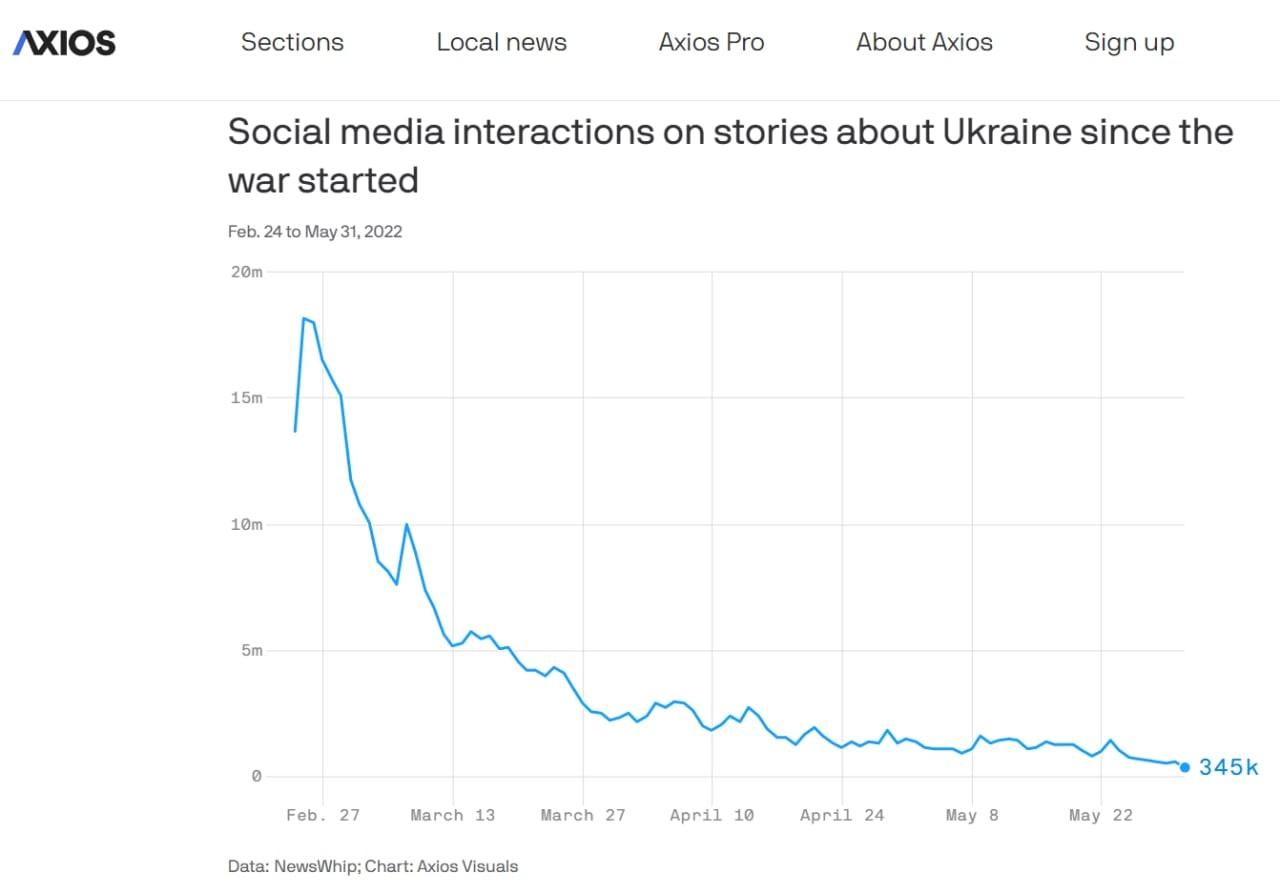 По данным Axios, количество взаимодействий в социальных сетях (лайков, комментариев, репостов) с новостными статьями, опубликованными об Украине, в период с первой недели войны до последней недели сократилось в 22 раза: со 109 миллионов до 4,8 миллиона.