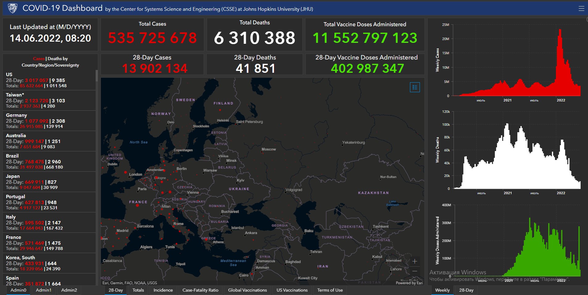 Всего в мире с начала пандемии коронавирусом заразились 535 миллионов 725 тысяч 678 человек. Больше всего в США (85 миллионов 632 тысячи 664), Индии (43 миллиона 230 тысяч 101), Бразилии (31 миллион 497 тысяч 38), Франции (29 миллионов 946 тысяч 647), Великобритании (22 миллиона 600 тысяч 145), России (18 миллионов 111 тысяч 240), Турции (15 миллионов 72 тысячи 747), Аргентине (9 миллионов 276 тысяч 618), Иране (7 миллионов 233 тысячи 880), Колумбии (6 миллионов 117 тысяч 847), Испании (12 миллионов 478 тысяч 994), Италии (17 миллионов 664 тысячи 43) и Германии (26 миллионов 915 тысяч 85).