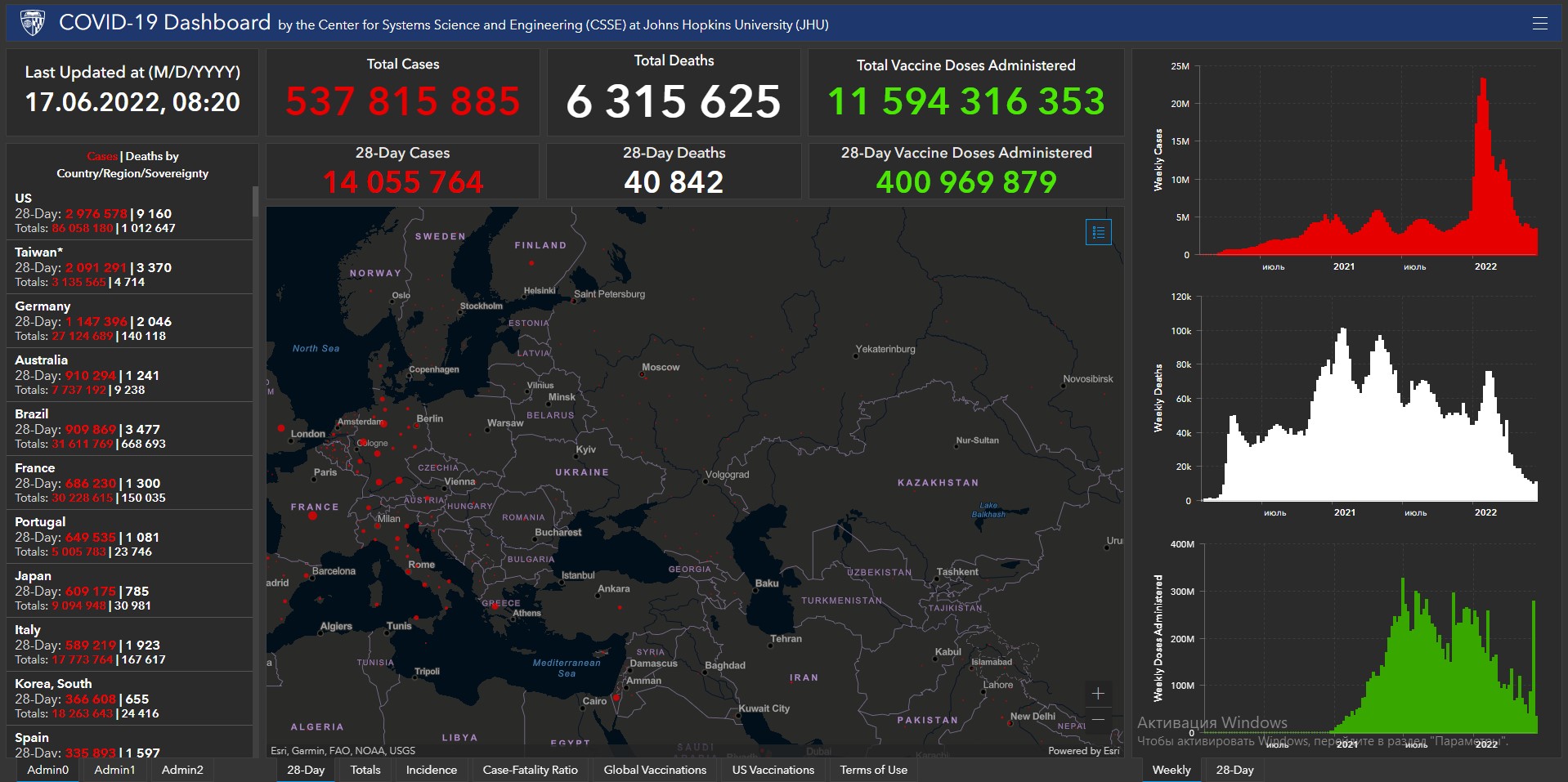 Всего в мире с начала пандемии коронавирусом заразились 537 миллионов 815 тысяч 885 человек. Больше всего в США (86 миллионов 58 тысяч 180), Индии (43 миллиона 251 тысяча 730), Бразилии (31 миллион 611 тысяч 769), Франции (30 миллионов 228 тысяч 615), Великобритании (22 миллиона 651 тысяча 908), России (18 миллионов 119 тысяч 934), Турции (15 миллионов 85 тысяч 742), Аргентине (9 миллионов 313 тысяч 453), Иране (7 миллионов 234 тысячи 367), Колумбии (6 миллионов 131 тысяча 657), Испании (12 миллионов 515 тысяч 127), Италии (17 миллионов 773 тысячи 764) и Германии (27 миллионов 124 тысячи 689).