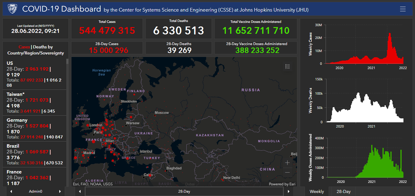 Всего в мире с начала пандемии коронавирусом заразились 544 миллиона 479 тысяч 315 человек. Больше всего в США (87 миллионов 92 тысячи 233), Индии (43 миллиона 407 тысяч 46), Бразилии (32 миллиона 130 тысяч 316), Франции (30 миллионов 879 тысяч 62), Великобритании (22 миллиона 834 тысячи 153), России (18 миллионов 152 тысячи 652), Турции (15 миллионов 96 тысяч 696), Аргентине (9 миллионов 367 тысяч 172), Иране (7 миллионов 236 тысяч 713), Колумбии (6 миллионов 151 тысяча 354), Испании (12 миллионов 681 тысяча 820), Италии (18 миллионов 259 тысяч 261) и Германии (27 миллионов 914 тысяч 240).