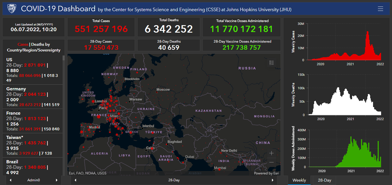 Всего в мире с начала пандемии коронавирусом заразились 551 миллион 257 тысяч 196 человек. Больше всего в США (88 миллионов 66 тысяч 96), Индии (43 миллиона 531 тысяча 650), Бразилии (32 миллиона 610 тысяч 514), Франции (31 миллион 861 тысяча 391), Великобритании (22 миллиона 942 тысячи 394), России (18 миллионов 176 тысяч 132), Турции (15 миллионов 180 тысяч 444), Аргентине (9 миллионов 394 тысячи 326), Иране (7 миллионов 241 тысяча 648), Колумбии (6 миллионов 175 тысяч 181), Испании (12 миллионов 890 тысяч 2), Италии (18 миллионов 938 тысяч 771) и Германии (28 миллионов 673 тысячи 212).
