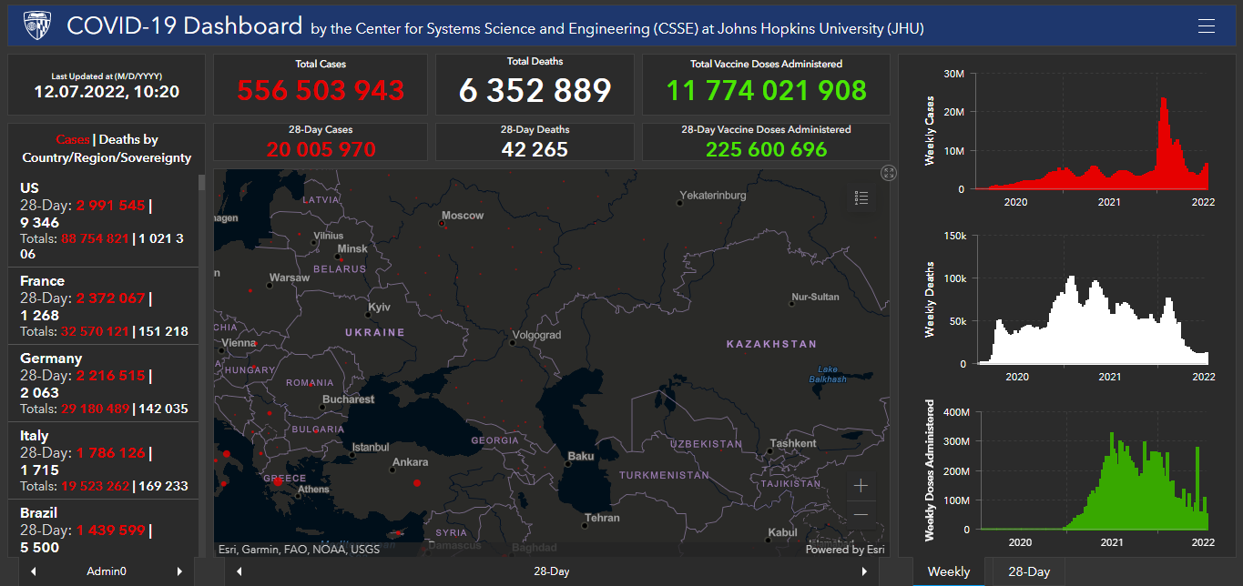 Всего в мире с начала пандемии коронавирусом заразились 556 миллионов 503 тысячи 943 человека. Больше всего в США (88 миллионов 754 тысячи 821), Индии (43 миллиона 639 тысяч 329), Бразилии (32 миллиона 940 тысяч 507), Франции (32 миллиона 570 тысяч 121), Великобритании (23 миллиона 88 тысяч 74), России (18 миллионов 195 тысяч 924), Турции (15 миллионов 180 тысяч 444), Аргентине (9 миллионов 426 тысяч 171), Иране (7 миллионов 251 тысяча 429), Колумбии (6 миллионов 198 тысяч 848), Испании (12 миллионов 973 тысячи 615), Италии (19 миллионов 523 тысячи 262) и Германии (29 миллионов 180 тысяч 489).