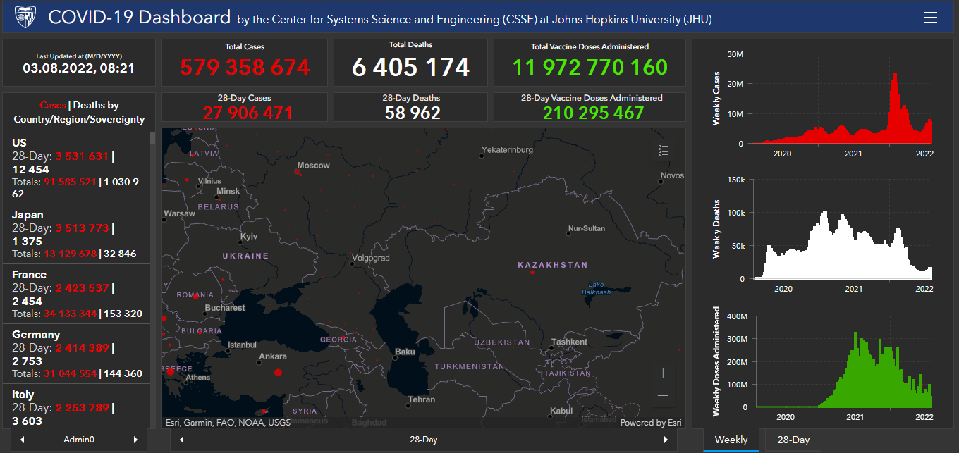 Всего в мире с начала пандемии коронавирусом заразились 579 миллионов 358 тысяч 674 человека. Больше всего в США (91 миллион 585 тысяч 521), Индии (44 миллиона 50 тысяч 9), Бразилии (33 миллиона 890 тысяч 428), Франции (34 миллиона 133 тысячи 344), Великобритании (23 миллиона 516 тысяч 253), России (18 миллионов 350 тысяч 864), Турции (15 миллионов 889 тысяч 495), Аргентине (9 миллионов 560 тысяч 307), Иране (7 миллионов 410 тысяч 75), Колумбии (6 миллионов 265 тысяч 798), Испании (13 миллионов 245 тысяч 996), Италии (21 миллион 124 тысячи 644) и Германии (31 миллион 44 тысячи 354).