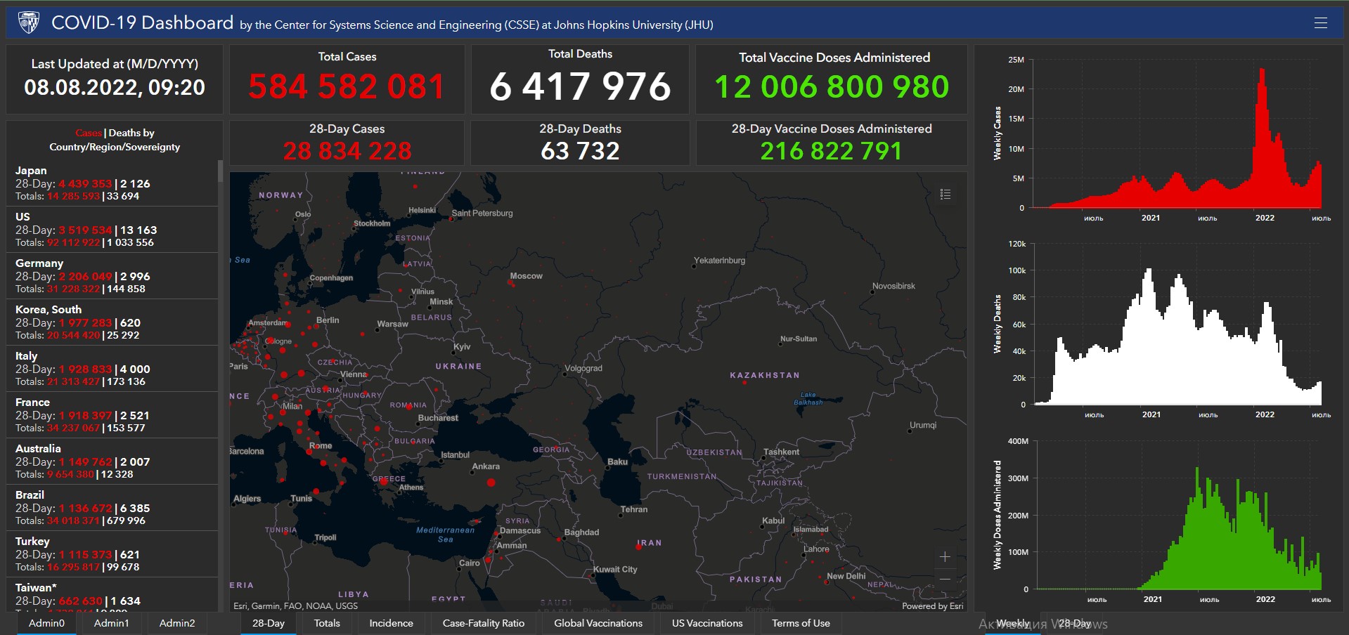 Всего в мире с начала пандемии коронавирусом заразились 584 миллиона 582 тысячи 81 человек. Больше всего в США (92 миллиона 112 тысяч 922), Индии (44 миллиона 145 тысяч 709), Бразилии (34 миллиона 18 тысяч 371), Франции (34 миллиона 237 тысяч 67), Великобритании (23 миллиона 582 тысячи 3), России (18 миллионов 440 тысяч 314), Турции (16 миллионов 295 тысяч 817), Аргентине (9 миллионов 602 тысячи 534), Иране (7 миллионов 440 тысяч 422), Колумбии (6 миллионов 278 тысяч 998), Испании (13 миллионов 266 тысяч 184), Италии (21 миллион 313 тысяч 427) и Германии (31 миллион 228 тысяч 322).