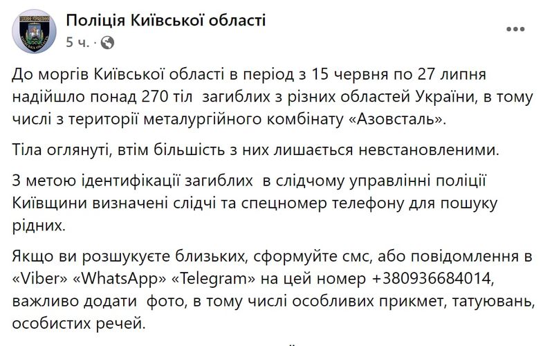 «Если вы разыскиваете близких, пошлите смс или сообщение в Viber, WhatsApp, Telegram на номер +380936684014, важно добавить фото, в том числе особых примет, татуировок, личных вещей», — обратилась полиция к населению.