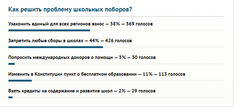 Чуть меньше — 38 процентов — предложили узаконить единый для всех регионов взнос. 11 процентов ответили, что для начала необходимо изменить Конституцию, согласно которой в Кыргызстане бесплатное образование. Оставшиеся 5 процентов респондентов считают уместным попросить о помощи международных доноров или взять кредиты на содержание и развитие школ.