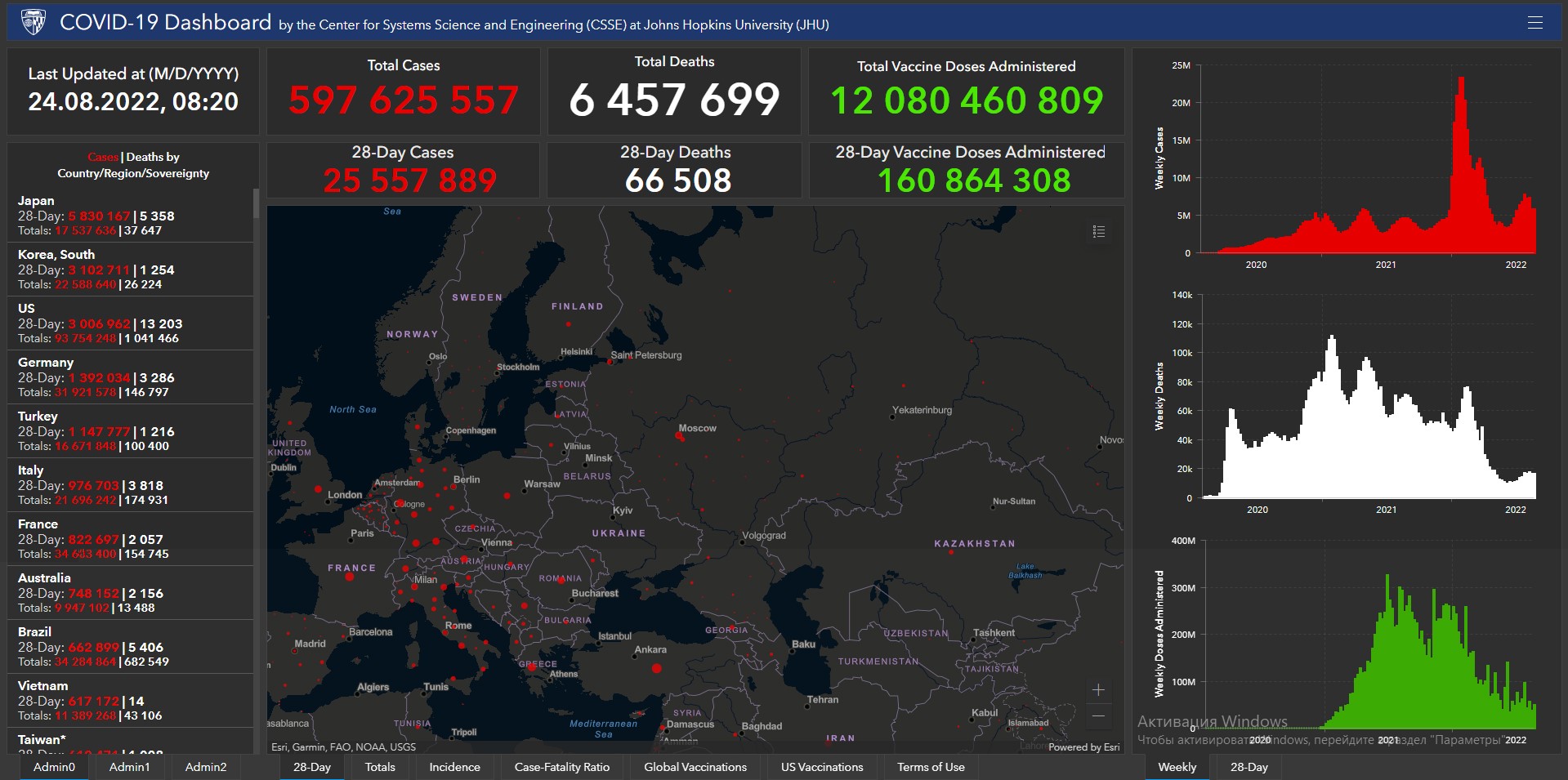 Всего в мире с начала пандемии коронавирусом заразились 597 миллионов 625 тысяч 557 человек. Больше всего в США (93 миллиона 754 тысячи 248), Индии (44 миллиона 357 тысяч 546), Бразилии (34 миллиона 284 тысячи 864), Франции (34 миллиона 603 тысячи 400), Великобритании (23 миллиона 675 тысяч 749), России (18 миллионов 902 тысячи 128), Турции (16 миллионов 671 тысяча 848), Аргентине (9 миллионов 658 тысяч 391), Иране (7 миллионов 513 тысяч 928), Колумбии (6 миллионов 293 тысячи 130), Испании (13 миллионов 323 тысячи 784), Италии (21 миллион 696 тысяч 242) и Германии (31 миллион 921 тысяча 578).