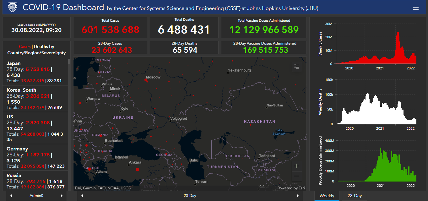 Всего в мире с начала пандемии коронавирусом заразились 601 миллион 538 тысяч 688 человек. Больше всего в США (94 миллиона 280 тысяч 83), Индии (44 миллиона 415 тысяч 723), Бразилии (34 миллиона 397 тысяч 205), Франции (34 миллиона 698 тысяч 583), Великобритании (23 миллиона 708 тысяч 661), России (19 миллионов 162 тысячи 384), Турции (16 миллионов 671 тысяча 848), Аргентине (9 миллионов 678 тысяч 225), Иране (7 миллионов 525 тысяч 628), Колумбии (6 миллионов 299 тысяч 595), Испании (13 миллионов 332 тысячи 976), Италии (21 миллион 814 тысяч 856) и Германии (32 миллиона 95 тысяч 854).