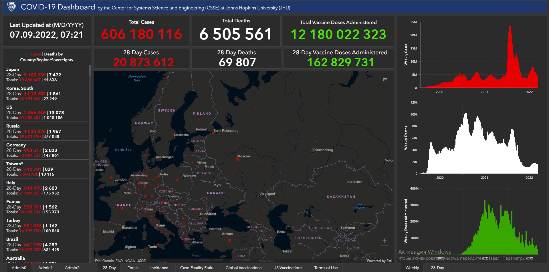 Всего в мире с начала пандемии коронавирусом заразились 606 миллионов 180 тысяч 116 человек. Больше всего в США (94 миллиона 880 тысяч 701), Индии (44 миллиона 464 тысячи 284), Бразилии (34 миллиона 477 тысяч 539), Франции (34 миллиона 839 тысяч 791), Великобритании (23 миллиона 738 тысяч 129), России (19 миллионов 521 тысяча 190), Турции (16 миллионов 797 тысяч 750), Аргентине (9 миллионов 689 тысяч 861), Иране (7 миллионов 535 тысяч 272), Колумбии (6 миллионов 302 тысячи 809), Испании (13 миллионов 358 тысяч 364), Италии (21 миллион 969 тысяч 725) и Германии (32 миллиона 297 тысяч 537).