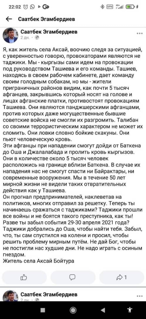 По информации ведомства, в соцсетях заблаговременно созданы группы фейковых аккаунтов от имени кыргызстанцев. Их продолжают создавать и сегодня. В их числе, например, некий пользователь Саатбек Эгамбердиев, который на самом деле не имеет никакого отношения к аккаунту с его именем.