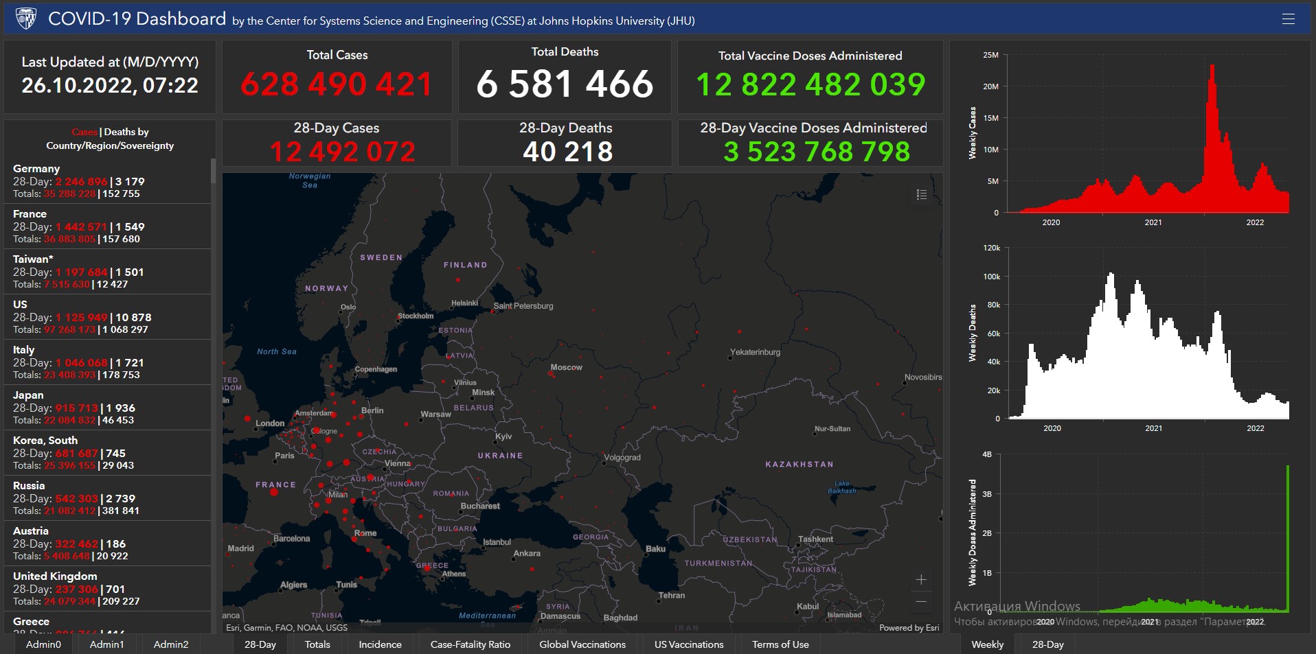Всего в мире с начала пандемии коронавирусом заразились 628 миллионов 490 тысяч 421 человек. Больше всего в США (97 миллионов 268 тысяч 173), Индии (44 миллиона 642 тысячи 346), Бразилии (34 миллиона 799 тысяч 324), Франции (36 миллионов 883 тысячи 805), Великобритании (24 миллиона 79 тысяч 344), России (21 миллион 82 тысячи 412), Турции (16 миллионов 919 тысяч 638), Аргентине (9 миллионов 717 тысяч 546), Иране (7 миллионов 556 тысяч 854), Колумбии (6 миллионов 309 тысяч 168), Испании (13 миллионов 488 тысяч 15), Италии (23 миллиона 408 тысяч 393) и Германии (35 миллионов 288 тысяч 228).