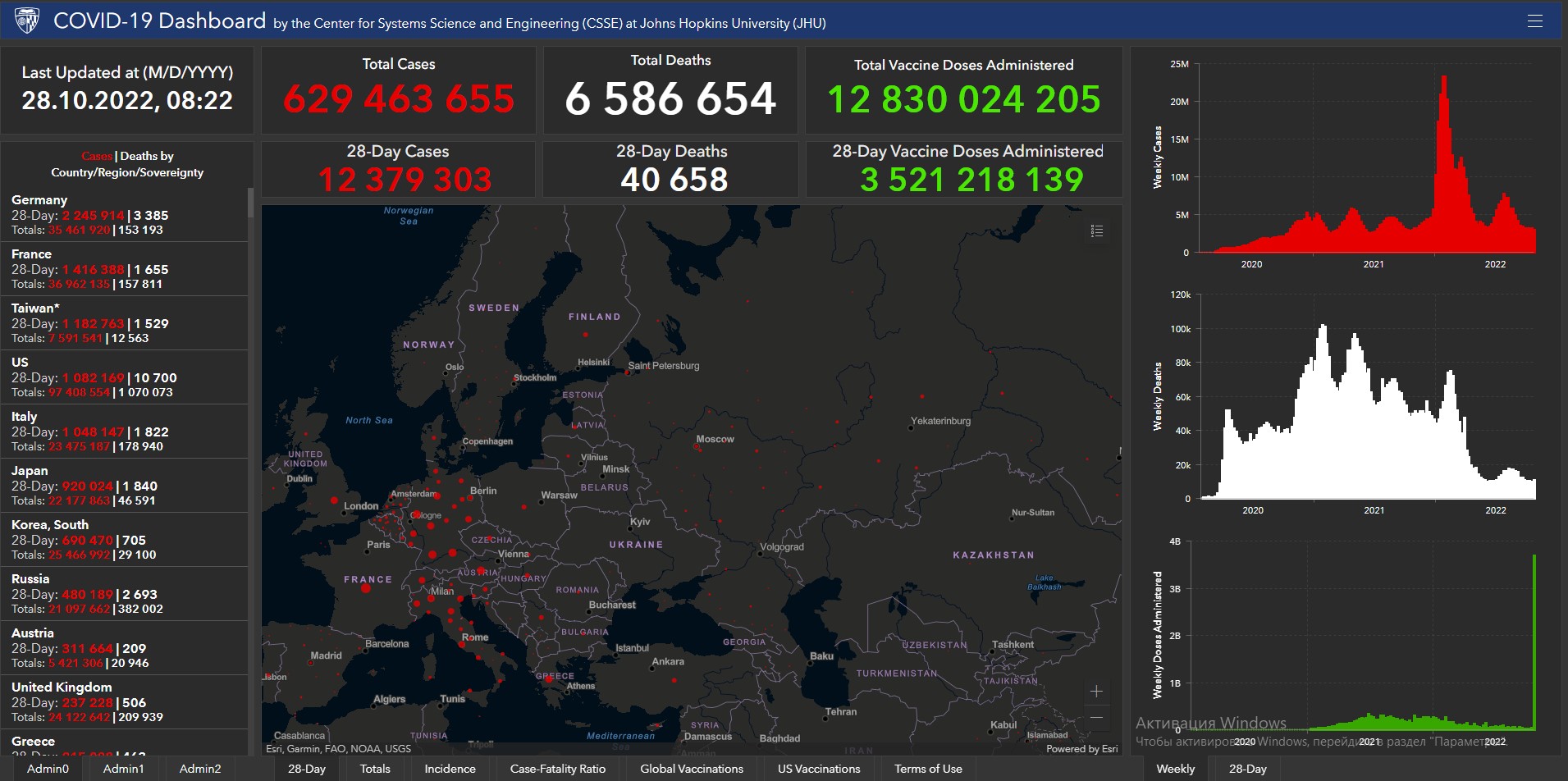 Всего в мире с начала пандемии коронавирусом заразились 629 миллионов 463 тысячи 655 человек. Больше всего в США (97 миллионов 408 тысяч 554), Индии (44 миллиона 644 тысячи 288), Бразилии (34 миллиона 815 тысяч 258), Франции (36 миллионов 962 тысячи 135), Великобритании (24 миллиона 122 тысячи 642), России (21 миллион 97 тысяч 662), Турции (16 миллионов 919 тысяч 638), Аргентине (9 миллионов 717 тысяч 546), Иране (7 миллионов 557 тысяч 134), Колумбии (6 миллионов 309 тысяч 168), Испании (13 миллионов 488 тысяч 15), Италии (23 миллиона 475 тысяч 187) и Германии (35 миллионов 461 тысяча 920).