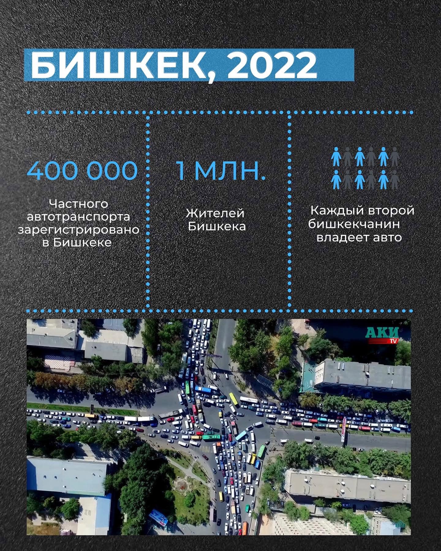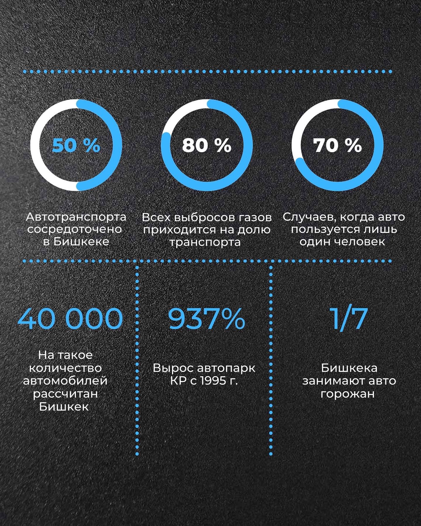 В городе с миллионным населением 400 тысяч частных машин. Каждый второй бишкекчанин владеет авто. 80 процентов всех выбросов газов приходится на автомобили. В 70 процентах случаев авто пользуется только один человек.
