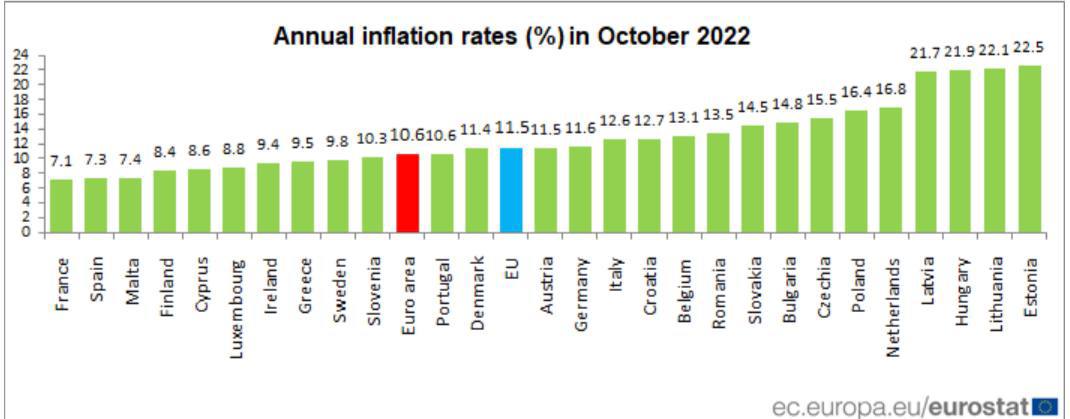 Новый рекорд инфляции в Евросоюзе в октябре 2022 года +11,5 процента после предыдущих рекордов в сентябре +10,9 процента, августе +10,1 процента, июле +9,8 процента, июне +9,6 процента, мае +8,8 процента и апреле +8,1 процента. Об этом сообщил Евростат.