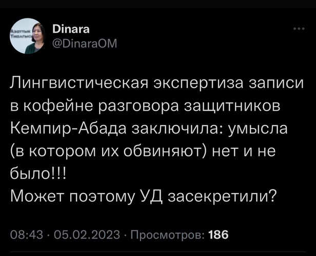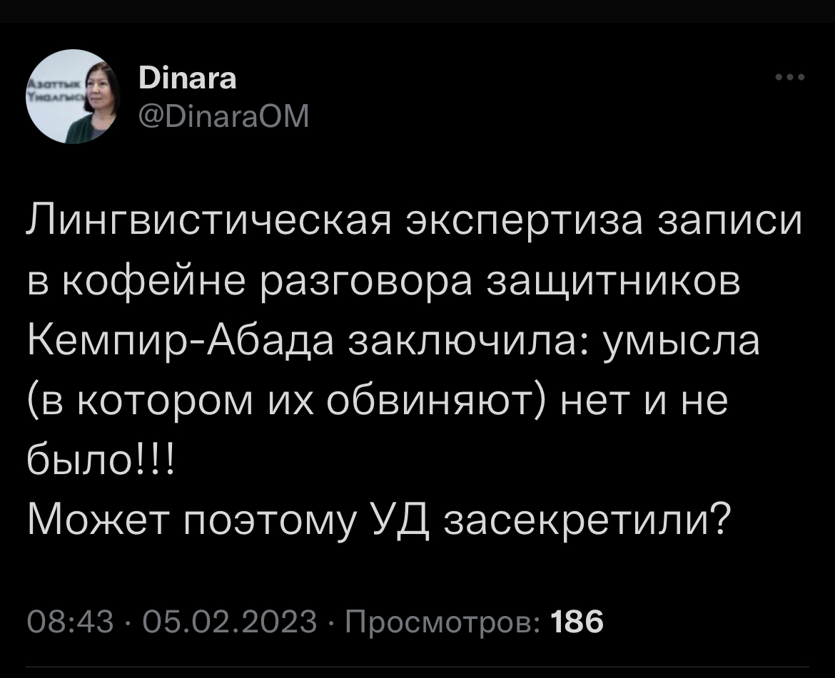 Как сообщила в Twitter правозащитница Динара Ошурахунова: «Лингвистическая экспертиза записи в кофейне разговора защитников Кемпир-Абада заключила: умысла (в котором их обвиняют) нет и не было».