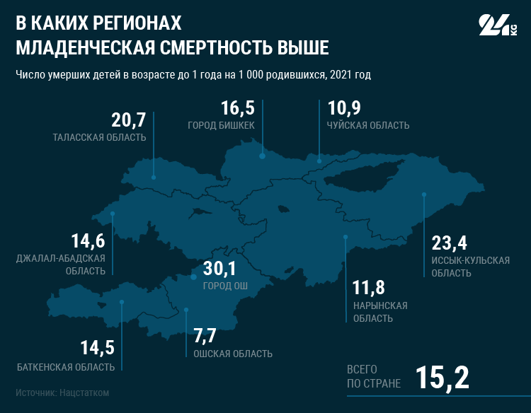 По данным НЦОМиД, в структуре причин младенческой смертности в целом по республике первое место занимают заболевания и состояния, возникающие в перинатальном периоде (57,6 процента в 2022 году): незрелость легких, изменения мозга, врожденная пневмония и другое. Это дети до семи дней жизни, в основном недоношенные.На втором месте — врожденные аномалии (16,7 процента), на третьем — болезни органов дыхания (10,3 процента).