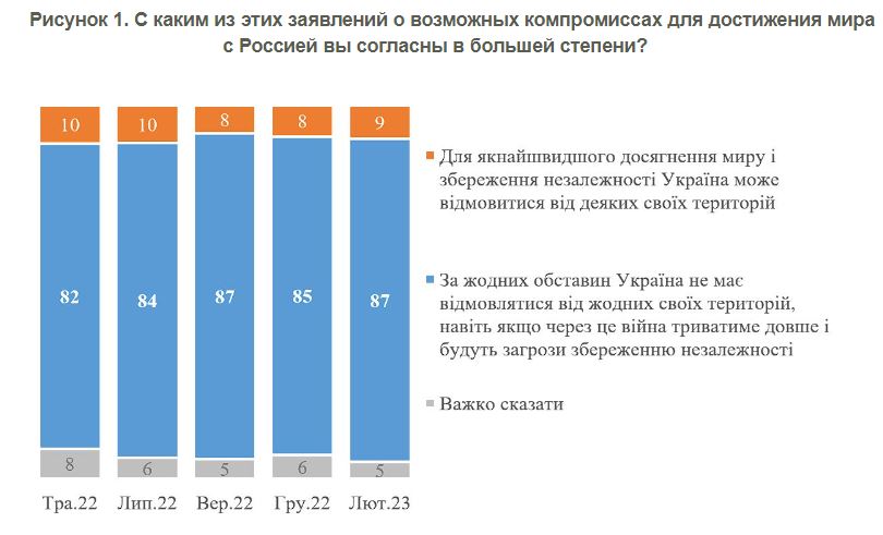 Девять процентов из числа респондентов полагают, что для достижения мира и сохранения независимости можно отказаться от некоторых территорий. В мае 2022-го таких насчитывалось 10 процентов, а в декабре — 8 процентов.