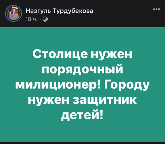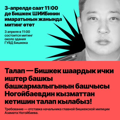 Завтра, 3 апреля, в Бишкеке состоится митинг за отставку начальника столичного ГУВД Азамата Ногойбаева. Об этом сообщила в соцсетях правозащитница Назгуль Турдубекова.
