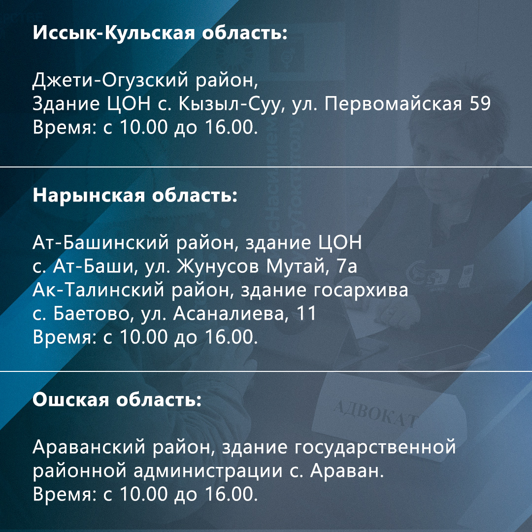 По ее данным, мероприятие пройдет во всех регионах Кыргызстана 4 мая в честь 30-летнего юбилея Конституции. По всем интересующим вопросам можно обращаться к начальнику управления юридической помощи и правового просвещения Айчурок Камаевой по номеру 0558024202.