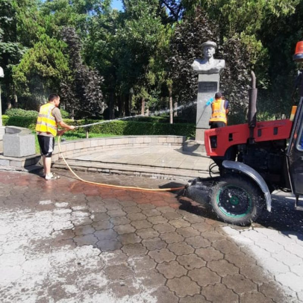 Сотрудники муниципального предприятия «Тазалык» продолжают мыть памятники Бишкека. Об этом сообщила пресс-служба мэрии.