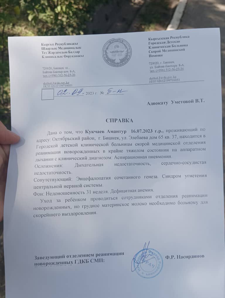 По ее словам, ребенок очень болен, самостоятельно не дышит, подключен к аппарату ИВЛ. «Он родился недоношенным. Моя дочь Айканыш очень тяжело переживала во время беременности, ее постоянно вызывали на допросы, и на фоне стресса она родила больного младенца», — отметила бабушка.